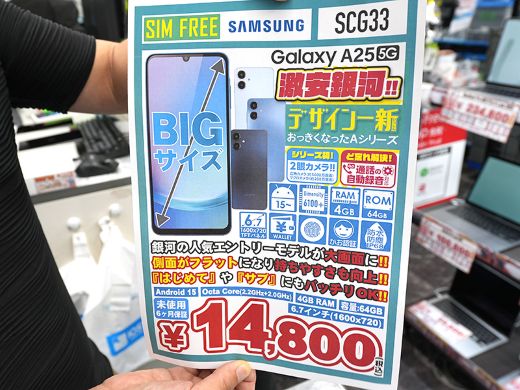 Samsungの6.7型スマホ「Galaxy A25 5G」が14,800円!未使用品セール