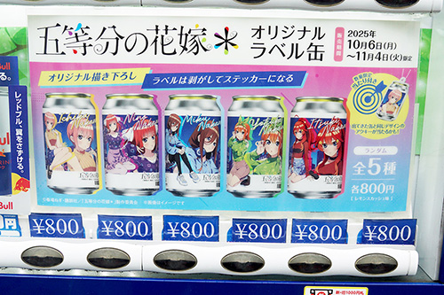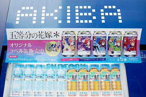 箱根そば 秋葉原店横の自販機では、「五等分の花嫁*」オリジナルラベルのコラボレーション缶が販売されていました。全5種で、ラベルを剥がすとステッカーに。飲料の中身はレモンスカッシュで、販売期間は11月4日(火)まで。