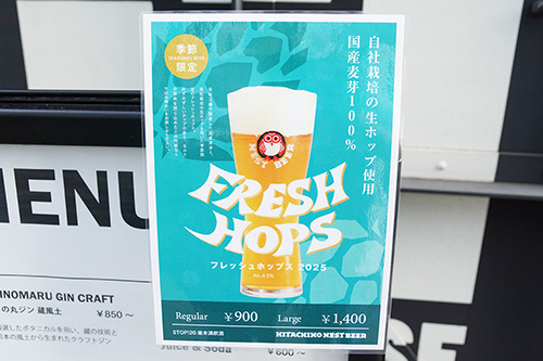 木内酒造 東京蒸溜所では、季節限定で常陸野ネストビール「フレッシュホップス2025」が販売されていました。国産麦芽100%自社栽培の生ホップを使用したビールとのこと。