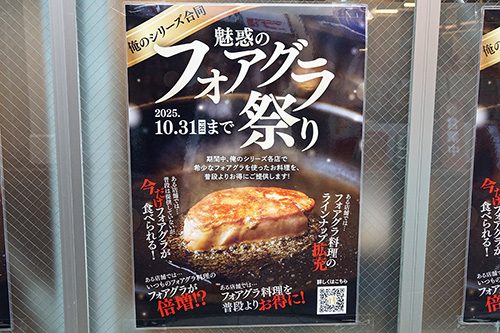 俺のフレンチGRILL&WINE 秋葉原では、「魅惑のフォアグラ祭り」が開催されていました。期間は10月31日(金)まで。なお、グループの系列店合同で行われているイベントで、各店ごとに内容が異なるフォアグラ料理を楽しめるイベントとなっています。