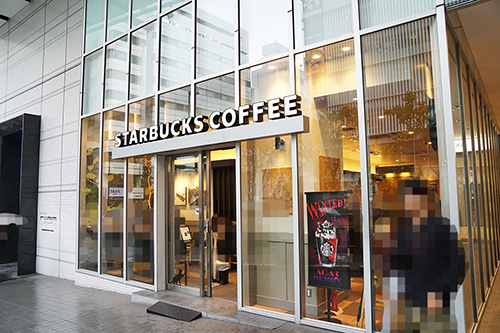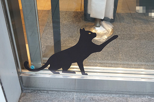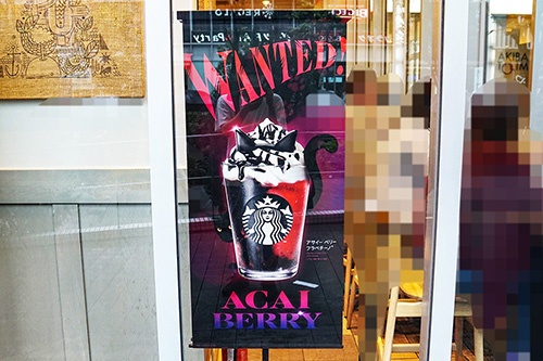 スターバックス コーヒー 秋葉原駅前店では、期間限定メニューの「アサイーベリーフラペチーノ」が販売されていました。フラペチーノには黒猫の耳をモチーフにしたチョコレートが飾ってあり、これに合わせて自動ドア横にも猫の装飾が施されていました。