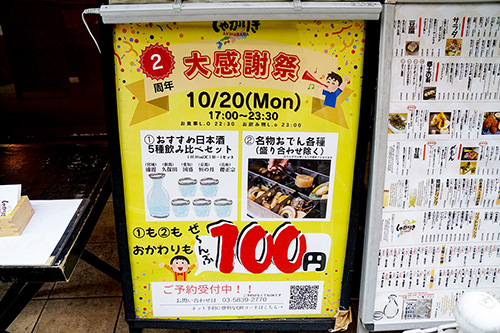 しゃかりき 秋葉原店では、10月20日限定で2周年を記念した大感謝祭開催。「おすすめ日本酒5種のみ比べセット」と「名物おでん各種(盛り合わせ除く)」が100円で注文可能なお得なキャンペーンとなっていました。