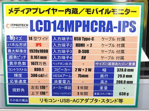 アナログ入力も備えた14インチモニターがITPROTECHから、メディアプレーヤー機能搭載
