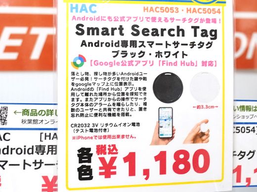 Androidの「Find Hub」に対応した落とし物タグ「Android専用スマートサーチタグ」が、秋葉館に入荷。