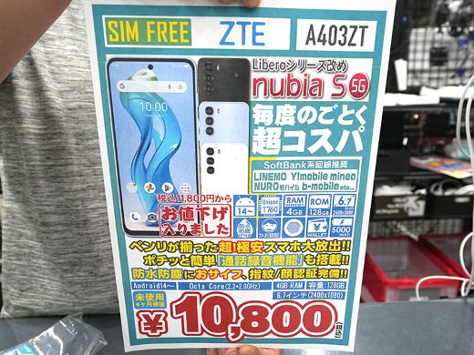 5G対応のZTE製6.6インチスマートフォン「nubia S 5G A403ZT」未使用品が、イオシス各店にてセール中。