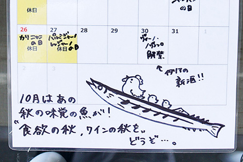 やきとりwine炭葡萄は店頭に営業日カレンダーを掲載。カレンダーにはワインにちなんだ記念日が記載され、枠外には手描きイラストが添えられていました。