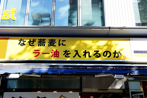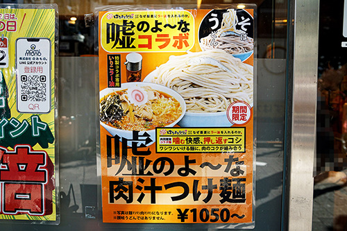 なぜ蕎麦にラー油を入れるのか。秋葉原2号店では、うどん屋「はなまるうどん」とコラボレーションした「嘘のよ~な肉汁つけ麺」が期間限定で販売されていました。うどんと蕎麦の異種格闘技戦のようなコラボ。