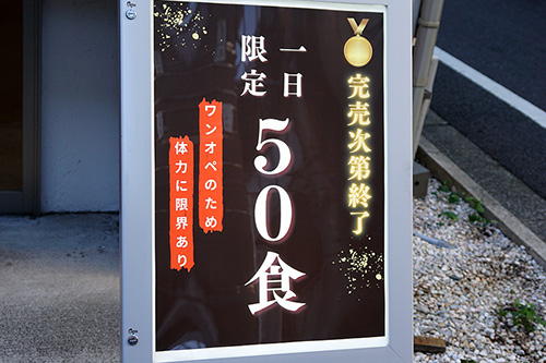 麻辣湯専門店JINの店頭に、「完売次第終了 一日限定50食」の文字が。限定メニューがあるのかとよく読んでみると、「ワンオペのため体力に限界あり」と一言添えてあり、通常営業自体なかなか困難な状況の模様。そこまで素直に書かなくても……と思ったりもしますが、苦労を感じる看板を掲示していました。