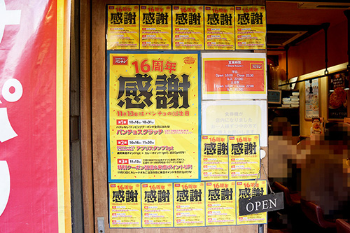 スパゲッティーのパンチョ 秋葉原昭和通り口店では、16周年を記念したキャンペーンが行われていました。創業日の11月13日(木)まで、スクラッチくじなどのキャンペーンを実施しています。