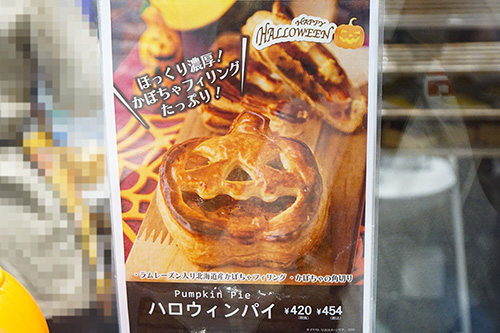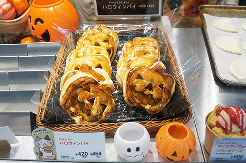 PIE mania アキバ・トリム店では、カボチャ頭の形を模したハロウィン仕様のパンプキンパイが販売されていました。