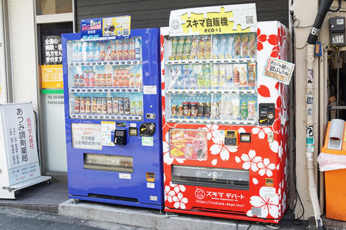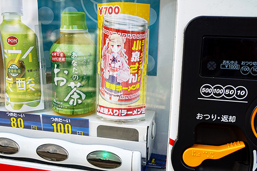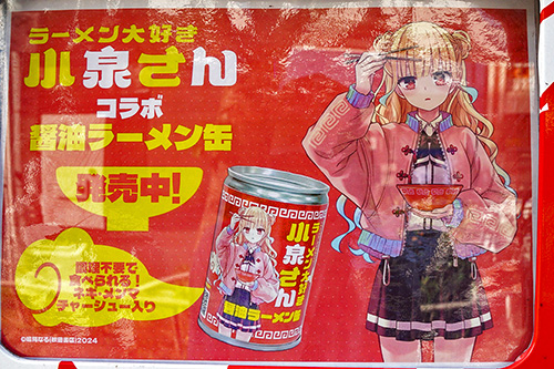 あつみ薬品前のスキマデパート(自動販売機)では、漫画「ラーメン大好き小泉さん」とコラボレーションしたラーメン缶が販売されていました。麺に加えチャーシュー・メンマ・ネギといったトッピングも入った醤油ラーメンを自動販売機で味わえる変わり種。スキマデパートの自動販売機であれば様々な地域でも購入できるようです。