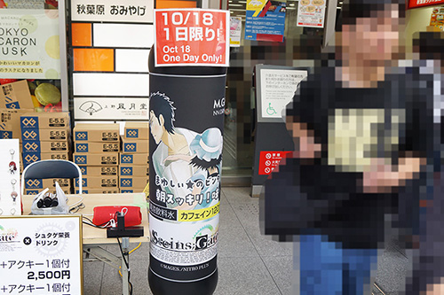 秋葉原ラジオ会館の入り口前では、「STEINS;GATE」のコラボカフェイン飲料「まゆしぃ★のビンタ(朝スッキリ!味)」が18日限定で店頭販売されていました。アクリルキーホルダーとのセット販売や、詰め放題も行われていました。