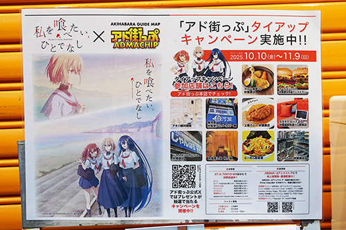 秋葉原の10店舗で、アニメ「私を喰べたい、ひとでなし」と「アド街っぷ」がタイアップしたキャンペーンを実施。対象店で1,100円以上の買い物をすると「限定ポストカード」がもらえるキャンペーンで、期間は11月9日(日)まで。