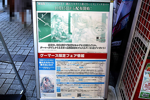 AKIHABARAゲーマーズ本店では、「劇場版プロジェクトセカイ 壊れたセカイと歌えないミク」とコラボレーションしたゲーマーズ限定フェアが開催されていました。15日から開催されており(無くなり次第終了)、種類を問わず店内の書籍を1冊購入すると限定絵柄のブックカバーが貰えます。このほか、「劇場版プロジェクトセカイ 壊れたセカイと歌えないミク」や「プロジェクトセカイ」関連のCD/DVD/Blu-rayを購入することでノベルティが貰えるキャンペーンも実施中(無くなり次第終了)。
