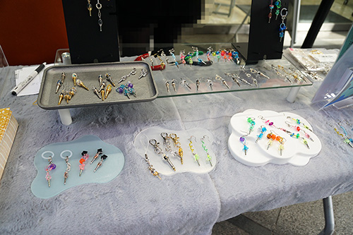 eイヤホン秋葉原店本館の店頭では、修理などで不要になった故障パーツを加工してアクセサリーにするサービスが行われていました。また、キーチェーンやアンブレラマーカー、USB Type-Cカバーなどの販売も行われていました。