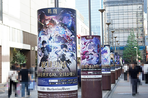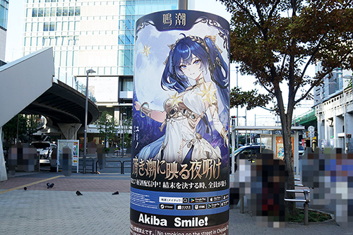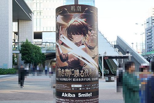秋葉原UDXでは、「鳴潮」ポップアップイベント「全共鳴者集結せよ」が開催されていました。ゲームキャラクターのパネル展示やコスプレイヤー撮影会のほか、UDXビルの1階部分には大規模な装飾を実施。これに合わせ、JR秋葉原駅 電気街口西側広場の円柱広告も「鳴潮」のものに。