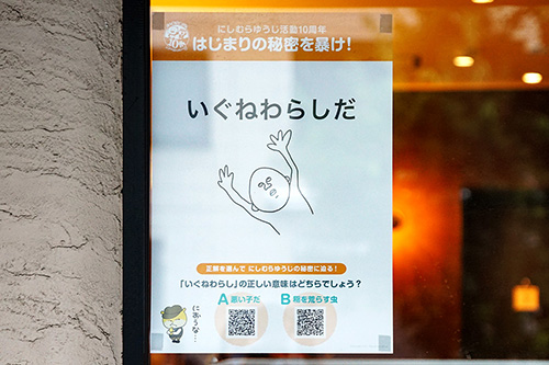 汁なし担々麺ピリリの店頭に、にしむらゆうじ活動10周年「はじまりの秘密を暴け!」のポスターが掲載されていました。