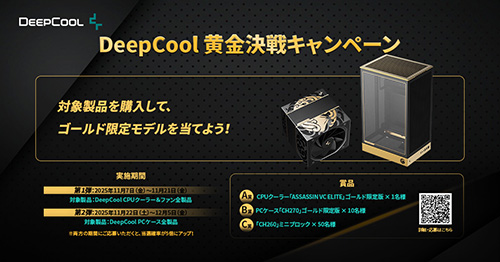 DeepCool製品の限定モデルなどが抽選で当たる「DeepCool黄金決戦キャンペーン」が、11月7日(金)から実施予定だ。