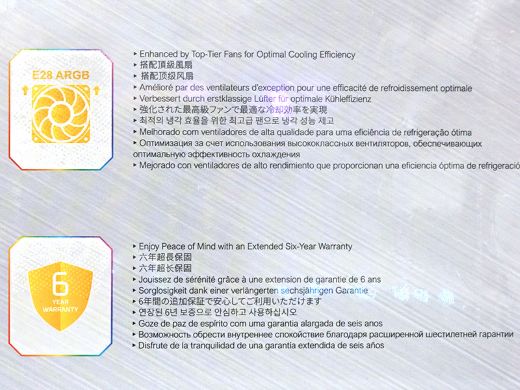 ファンには120mm角ARGBファン「E28 ARGB」を採用。回転数は800~2,200RPM±10%、風量最大96.27CFM、静圧最大4.13mmH2O、騒音値は36.25dBA。