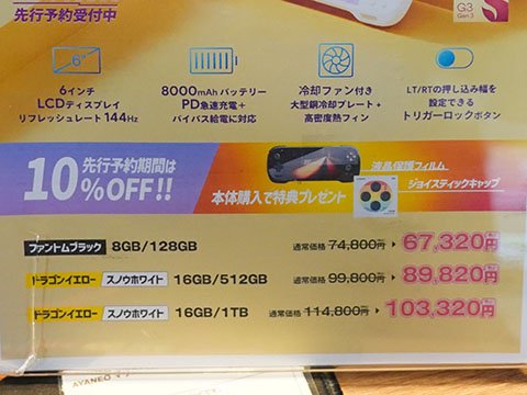 カラー(ファントムブラック、ドラゴンイエロー、スノウホワイト)と、メモリ/ストレージ容量(8GB/128GB、12GB/256GB、16GB/512GB、16GB/1TB)の違いで複数のモデルが用意されている。先行予約価格は67,320~103,320円。