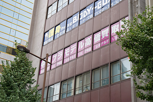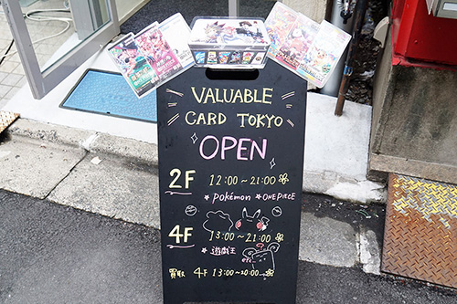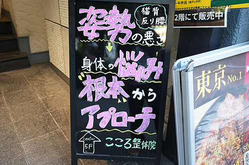 VALUABLE CARD TOKYO 秋葉原は、取り扱いしているカードゲームに合わせたイラスト付きの案内板を掲示。こころ整体院 秋葉原院は、猫背や反り腰による身体の悩みを改善する旨をアピール。