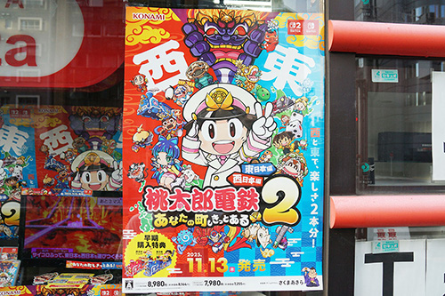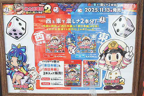 アウトレットプラザの店頭に、「桃太郎電鉄2 ~あなたの町も きっとある~」の発売告知ポスターが掲載されていました。11月13日(木)発売予定、Switch2用パッケージ版は「東日本編」と「西日本編」の2本が入って8,980円。