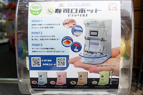 取材中に見かけたカプセルトイをご紹介。Minecraftのキャラクターをデフォルメした「Minecraft ライトマスコット2」や、鈴茂器工株式会社のシャリを自動で握る「寿司ロボット」のミニチュアマスコットフィギュア、往年のレーシングエンジンを再現した「無限エンジンコレクション」などが登場していました。