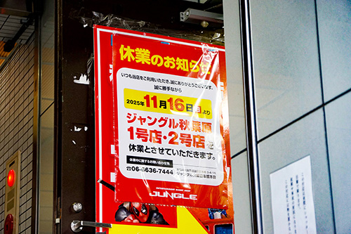 ジャングル秋葉原1号店に、11月16日(日)から休業する旨の告知が掲載されていました。休業するのは、ジャンク通り沿いの「ジャングル秋葉原1号店」とラジオ会館内の「ジャングル秋葉原2号店」の2店舗。
