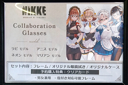 アニメコラボメガネ専門店Animeganeでは、「勝利の女神:NIKKE」とのコラボメガネの予約受付が開始されていました。ゲーム内の特殊別働隊「カウンターズ」をイメージした4モデルをラインアップ。店頭に、各キャラクターのイメージイラストが描かれた等身大パネルも設置しています。