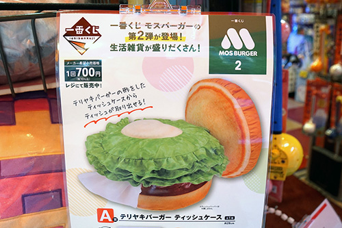ラムタラ エピカリ アキバでは、一番くじ「モスバーガー」第2弾が1回700円で販売されていました。モスバーガーをテーマにした生活雑貨やグッズが景品となっていて、A賞はテリヤキバーガーの形をしたティッシュケースとなっています。