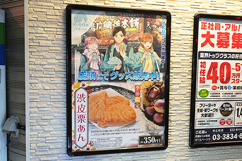 鳴門鯛焼本舗 末広町店では、「アオのハコ」とコラボレーションした「渋皮栗あん」たい焼きが販売されていました。コラボたい焼き以外にグッズの販売も行っています。