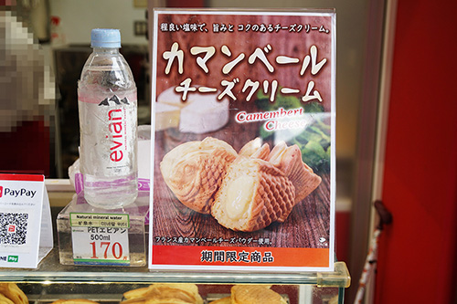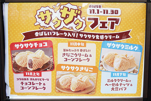 横浜くりこ庵 秋葉原店では、クリームに香ばしいフレークを入れた「サクザクフェア」限定メニューが販売されていました。また、期間限定で「カマンベールチーズクリーム」たい焼きも販売されています。