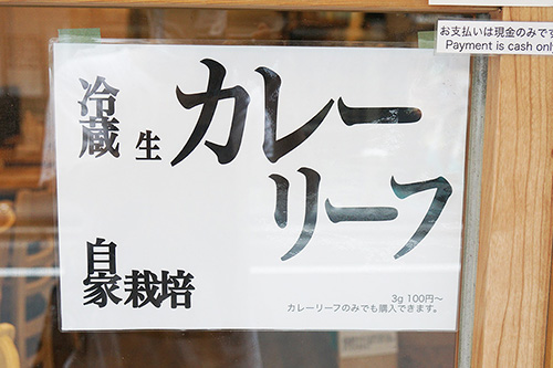 モチヅキカレーに、生の「カレーリーフ」販売をアピールするポップが掲載されていました。カレーはもちろん、様々な料理で使えるスパイスとなっています。