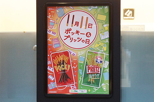 NewDays 神田万世橋ビルの店頭に、「11月11日 ポッキー&プリッツの日」をアピールするポスターが掲載されていました。「ポッキー&プリッツの日」に合わせてポッキーやプリッツのピックアップ販売も行われます。