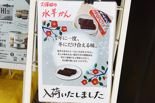 ちゃばら内の日本百貨店しょくひんかんでは、「久保田の水羊かん」が販売されていました。福井の定番冬スイーツで、コタツや温かい部屋で冷たい水羊かんを食べる風習があるのだとか。
