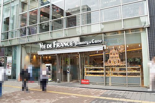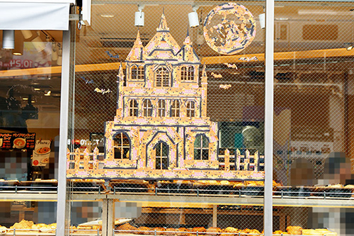 ヴィ・ド・フランス秋葉原電気街口店の店頭で、力作のハロウィン装飾を見つけました。マスキングテープで作られた切り絵で、ハロウィンをイメージした古城が見事に描かれています。