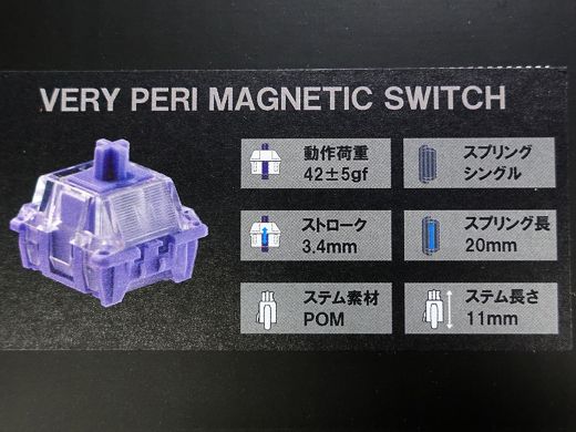 Very Peri Magnetic Switchモデルでは、一般的な磁気スイッチと同様、バネを内蔵したCherry MXスイッチ互換デザインのキースイッチを搭載。