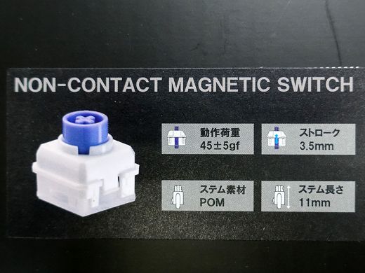 Non-Contact Magnetic Switchモデルでは、同社が「ハイブリッド型静電容量ホットスワップ無接点HEスイッチ」「べリペリ無接点(静電容量)HE 45gスイッチ」「静電容量無接点スイッチ」「無接点型磁気スイッチ」などと呼ぶ、シリコンドームを採用したキースイッチを搭載。
