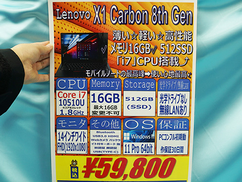 Core i7-10510U(4コア/8スレッド)搭載の14インチノート「ThinkPad X1 Carbon 8th Gen」の中古品が、PCコンフル 秋葉原3号店でセール中。