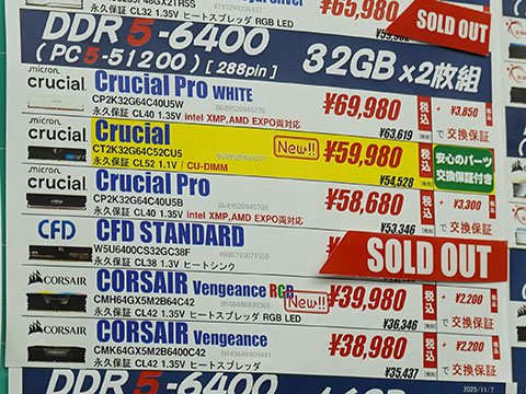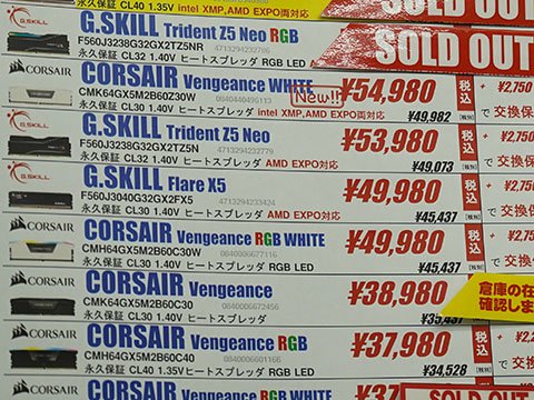 32GB×2枚組の「CMH64GX5M2B6400C42」と「CMK64GX5M2B6000Z30W」については、DDR5-6000より高速なDDR5-6400のほうが安価という価格の逆転が起きており、AMD EXPOの有無もあるが、15,000円の大きな価格差が生じている。