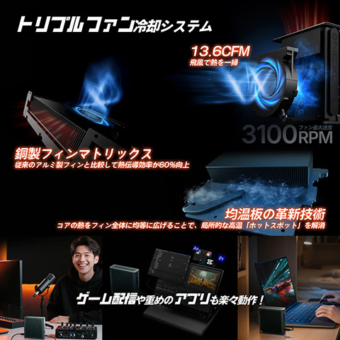 冷却には最先端のトリプル冷却システムを採用したとうたう。13.6CFMの高風量ファンが熱を素早く放出し、スチール製フィンアレイが効率的に排熱するとしている。