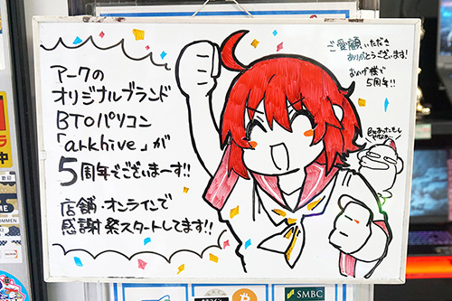 パソコンショップアークでは、オリジナルブランドのBTOパソコン「arkhive」の5周年を記念したイラストを掲載。また、パソコン工房 秋葉原パーツ館では、ユニットコムの系列店が記されたマップ看板が設置されていました。パソコン工房 秋葉原パーツ館からパソコンショップアークまでをぐるっと歩き回って、取り扱い品目の違いなどを見比べてみるのも面白いかもしれません。