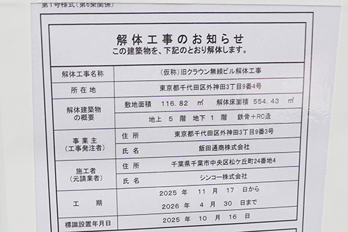 「クラウン無線」の旧本社ビルに解体工事の告知が出ていました。解体工事は2026年4月末に終了予定。なお、「クラウン無線」の本社は千代田区外神田3-9-10にある東京営業所と統合するかたちで移転しています。