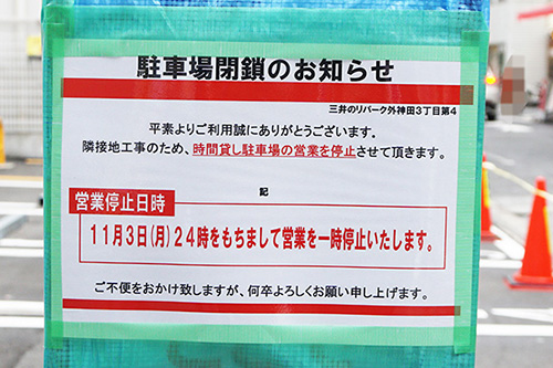 パソコンショップアークの斜め向かいにある駐車場「三井のリパーク外神田9丁目第4」が営業を一時停止していました。駐車場閉鎖のお知らせには営業再開予定の記載はなく、閉鎖期間は不明となっています。