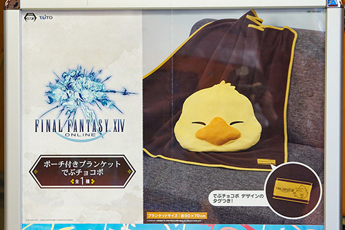 「でぶチョコボ」のポーチ付きブランケットなど、アキバで見かけたプライズ