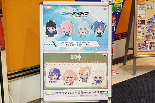 取材中に見かけたプライズをご紹介。「ファイナルファンタジーXIV ポーチ付きブランケット でぶチョコボ」や、「アイドルマスター シャイニーカラーズ ESPRESTO-Highly detail-樋口円香 Special assort」プライズフィギュア、「ブルーアーカイブ」や「原神」のちびぐるみなどが登場していました。