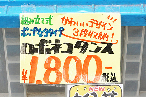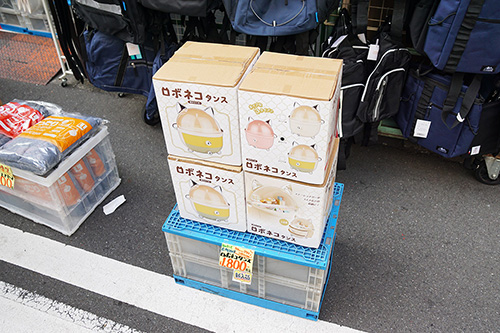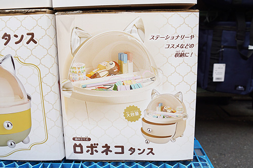 あきばお~弐號店では、一風変わった収納具「ロボネコタンス」が1,800円で販売されていました。小型の3段収納で文房具やコスメの収納に最適、猫のような可愛らしいデザインになっています。