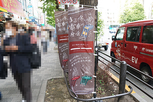 サンコーレアモノショップ 秋葉原総本店では、冬に向けて「まるで冬の電車の座席ヒーター」が販売中。店頭にのぼりが出ていました。「寒い時期についウトウトしちゃう電車の座席を再現」したヒーターとのことです。