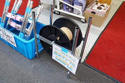千石電商 秋葉原2号店では、ケーブルやワイヤーホイールを固定するための組み立て式ケーブルスタンドが300円で特価販売されていました。「返品交換一切不可!!質問NG!!」との記載がありますが、組み立て済みサンプルがあるので、どのような製品なのかはわかるようになっています。