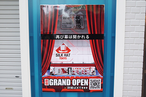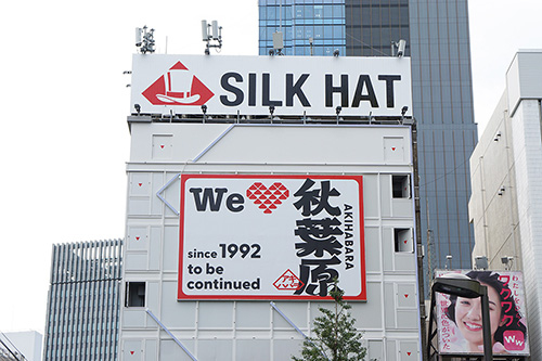 「シルクハット秋葉原」の作業足場が撤去され外観がわかる状態になっていました。壁面には「We Love 秋葉原」のメッセージが大きく掲げられています。